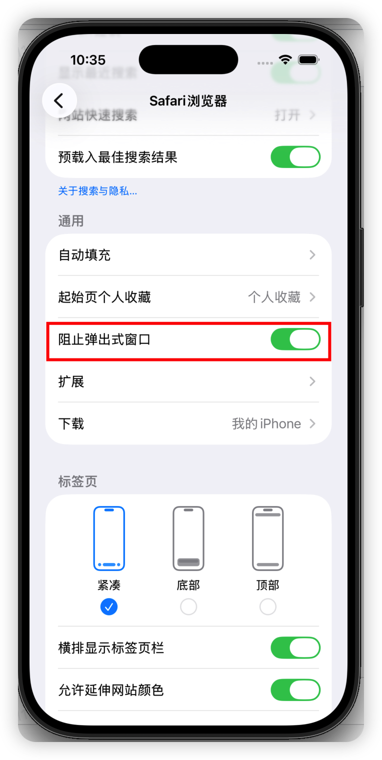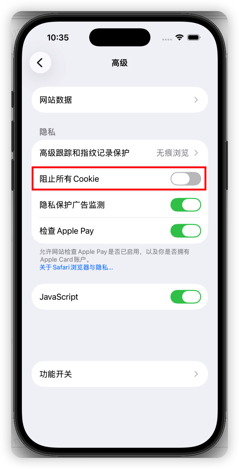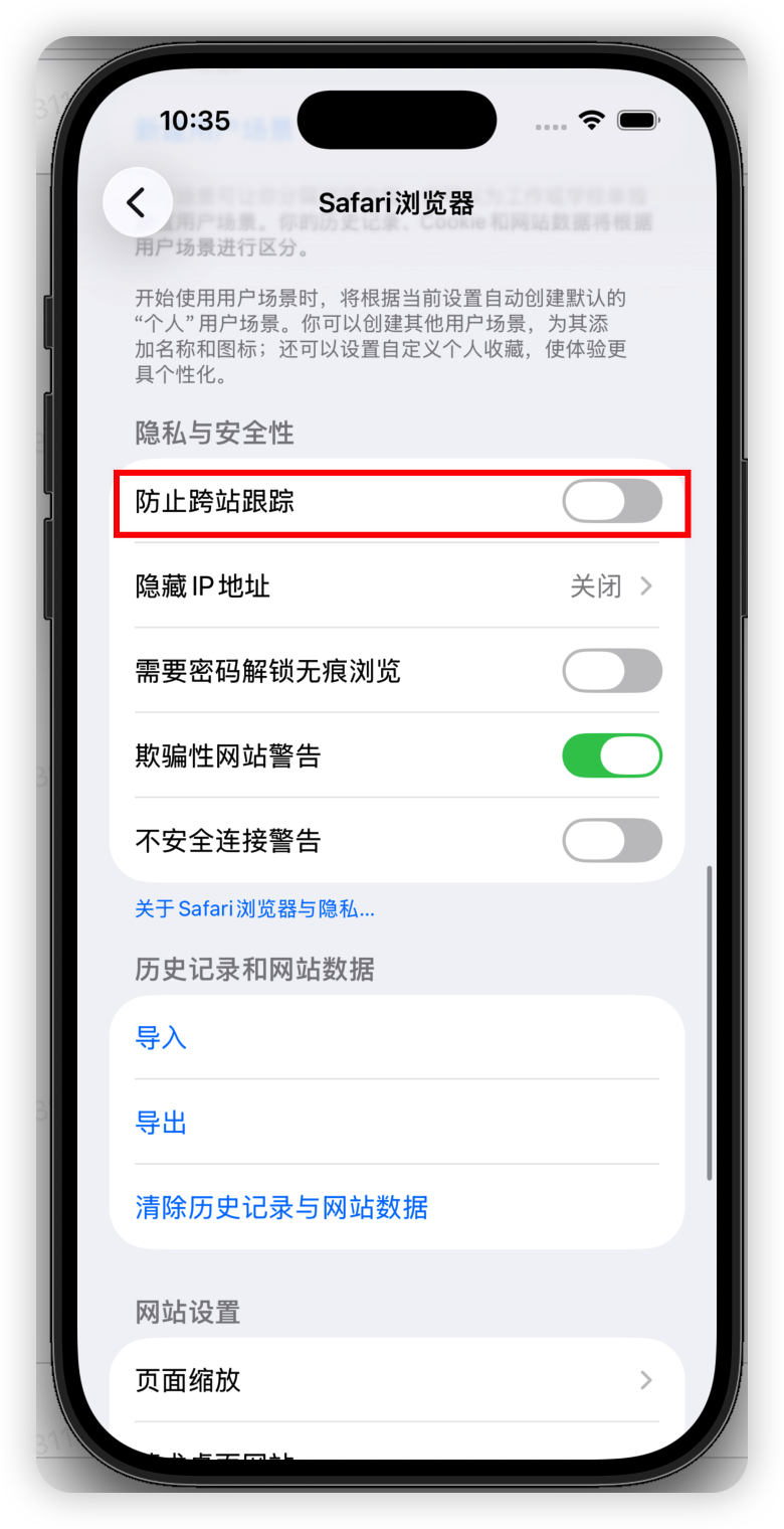 向下滑动找到 "防止跨站追踪",确保将其关闭