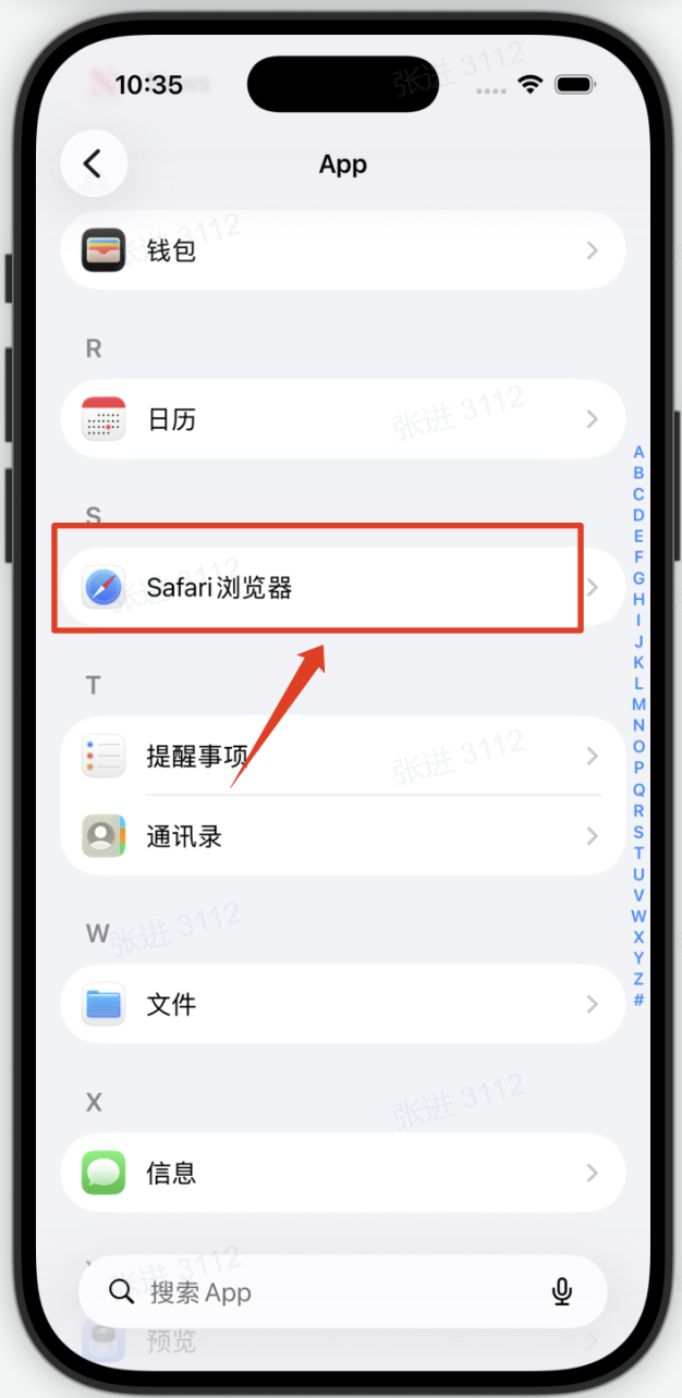 向下滚动点击 "APP" 并选择 "Safari浏览器"