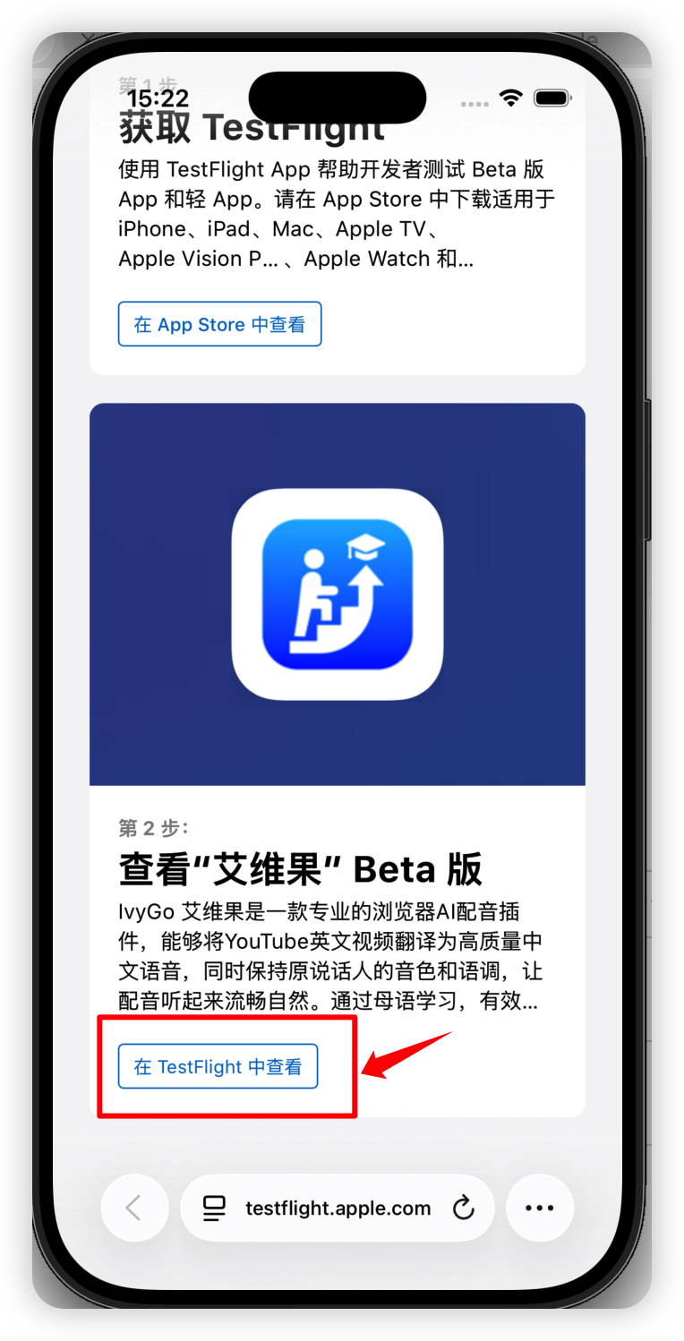 - 打开以下链接,然后点击 在TestFlight中查看 加入测试:https://testflight.apple.com/join/VqYRgKgQ